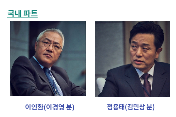 해외공장 관련 하여 조직 내 독보적인 인물로 국정원 해외정보국 국장입니다. 과거에는 불같은 성질로 유명했지만 나이가 들면서 온화하고 유연한 성품으로 바뀌었습니다. 조직 내에서 인품이나 실력 면에서 부하직원들이 신망이 높습니다. 해외 파트 넘버 2이자 차기 차장으로 유력합니다.