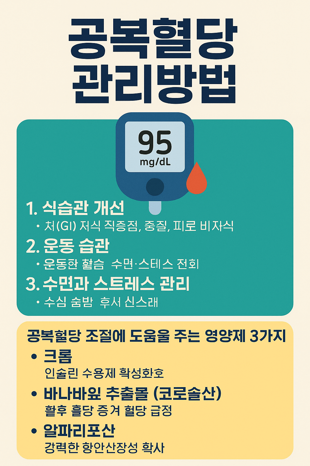 공복혈당 관리는 식습관과 운동이 기본이지만, 올바른 영양제의 병행은 인슐린 민감성을 높이고 포도당 대사를 개선하는 데 실질적인 도움을 줄 수 있습니다.