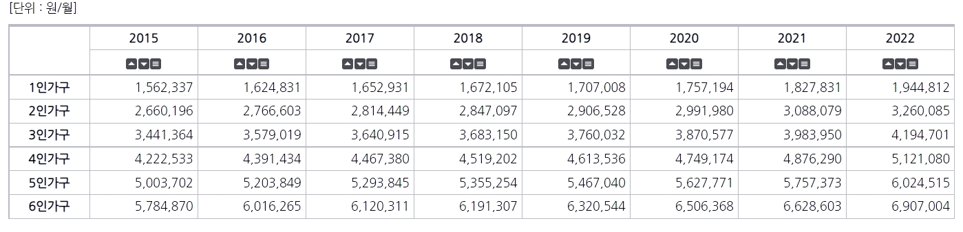 아래는 2015년부터 2022년까지 기준 중위소득 표입니다.